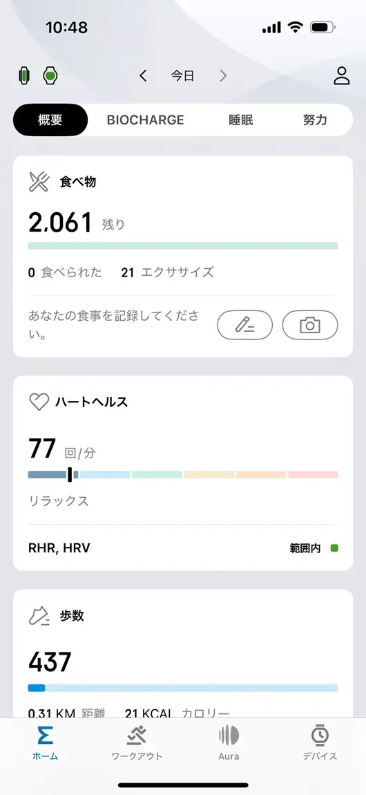 ・健康管理機能の進化: 新しいBioChargeスコアやレディネススコア、心拍・睡眠・酸素濃度などの常時計測に加え、食事管理も可能。